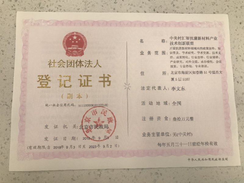 中关村汇智抗菌新材料产业技术创新联盟(简称“中关村抗菌产业联盟”)是由从事抗菌技术研究、材料开发、产业应用、性能评价、行业服务等的相关高校、科研院所、企业、检测机构、服务单位等共同发起成立的非营利性社会团体,业务指导单位为中关村科学园区管理委员会,业务主管单位为北京市民政局。
